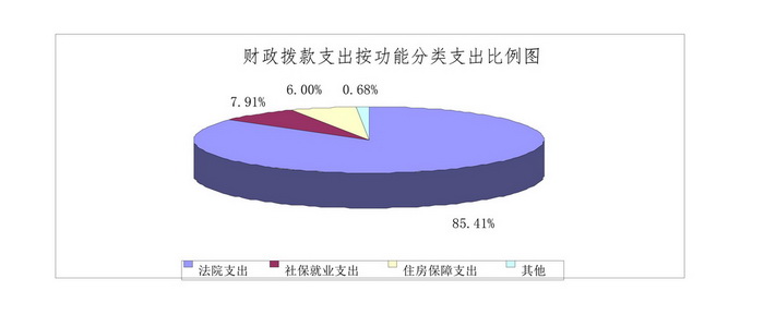 江蘇省高級人民法院2014年度財政撥款支出主要用于以下幾個方面:法院支出19265.57萬元,占85.41%;社會保障和就業支出1784.9萬元,占7.91%;住房保障支出1353.95萬元,占6%;其他支出153.36萬元,占0.68%。