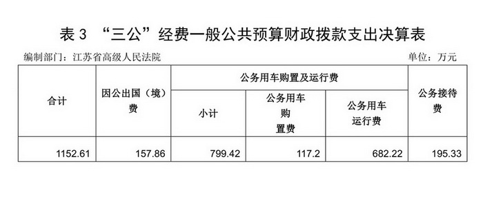 2014年度江蘇省高級人民法院一般公共預算撥款安排的“三公”經費支出中,因公出國(境)費支出157.86萬元,占13.7%;公務用車購置及運行費支出799.42萬元,占69.36%;公務接待費支出195.33萬元,占16.94%。具體情況如下: