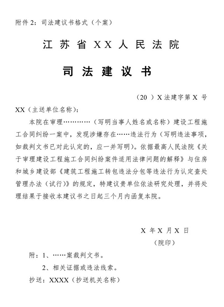 第十七條 全省各級(jí)人民法院在審理建設(shè)工程施工合同糾紛的過程中發(fā)現(xiàn)建設(shè)單位、施工單位和相關(guān)人員涉嫌存在以下違法行為的,應(yīng)當(dāng)以《江蘇省建筑工程施工合同備案管理辦法》(蘇建規(guī)字【2015】1號(hào))備案的合同為依據(jù),并依照住房和城鄉(xiāng)建設(shè)部《建筑工程施工轉(zhuǎn)包違法分包等違法行為認(rèn)定查處管理辦法(試行)》(建市【2014】118號(hào)文)的規(guī)定,向工程所在地的同級(jí)建設(shè)主管部門提出司法建議,并將相關(guān)證據(jù)或違法線索一并移送: