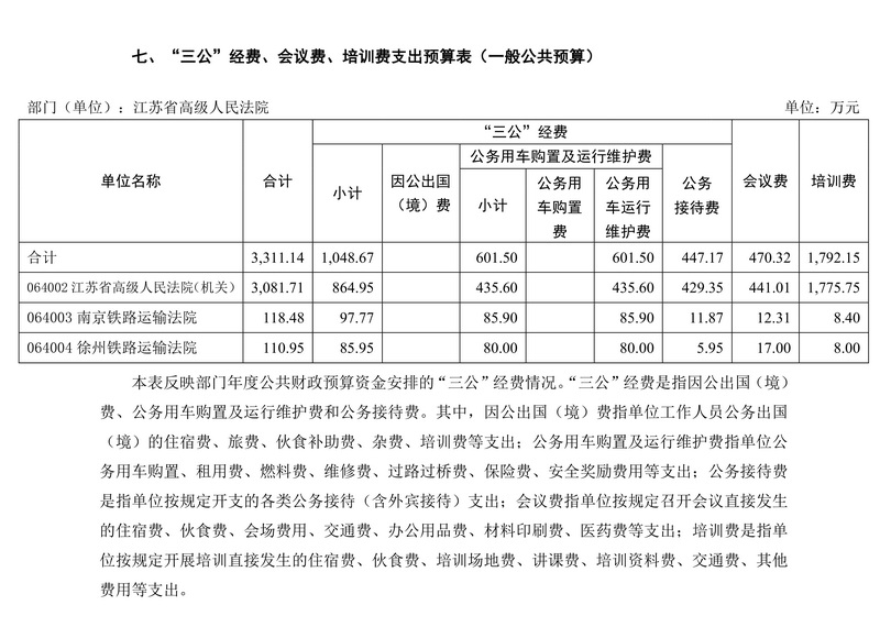 2、項目支出11,595.27萬元,用于審判、執行、司法救助等業務經費3898.8萬元,司法分類管理改革經費400萬元,辦公設備及執法用車報廢更新購置費631.76萬元,信息化建設及維護經費1748萬元,江蘇法官學院教學及法院系統人員培訓經費1955.75萬元,物業管理、后勤保障及辦公用房租賃等經費1919.96萬元,扶貧及援疆援藏援青經費400萬元,南京、徐州2家鐵路運輸法院項目經費641萬元。
