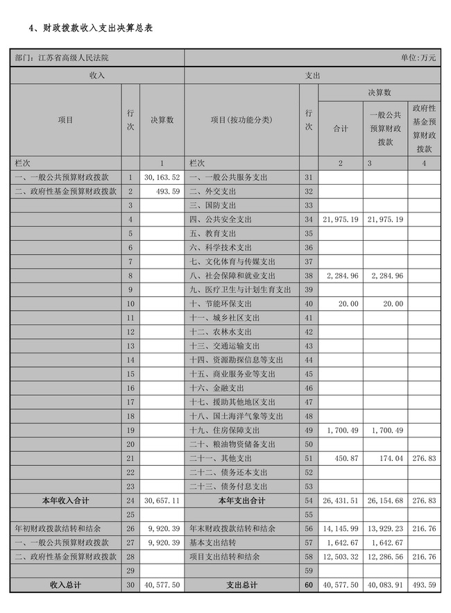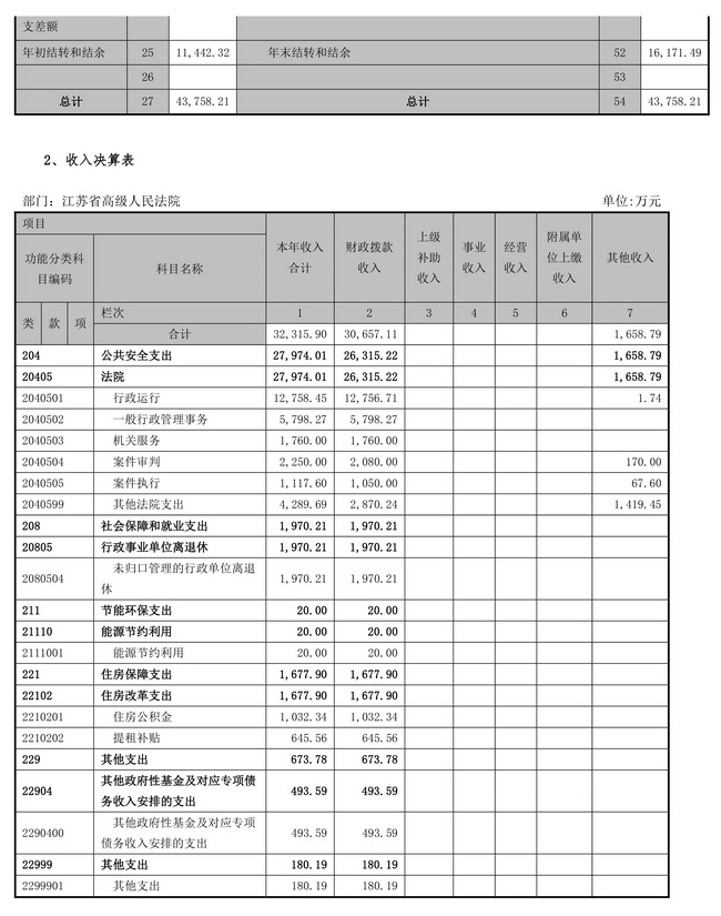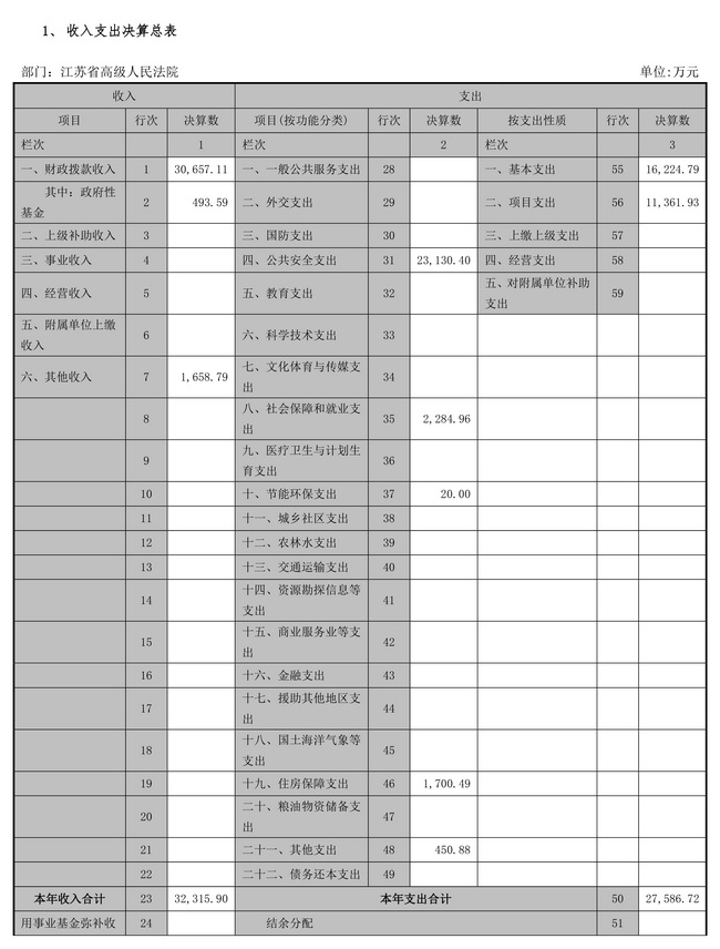 江蘇省高級人民法院本年收入合計(jì)32315.9萬元,其中:財(cái)政撥款收入30657.11萬元,占94.87%;其他收入1658.79萬元,占5.13%。