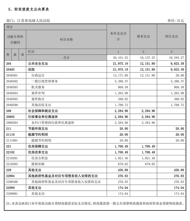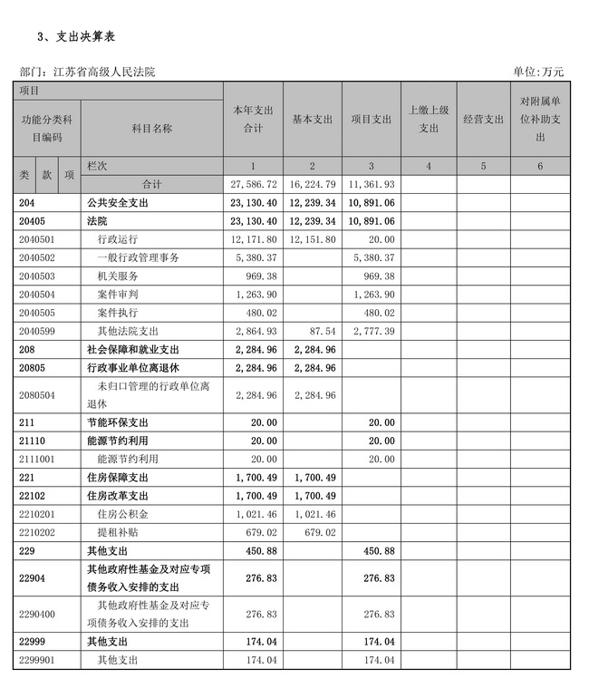 江蘇省高級人民法院本年支出合計(jì)27586.72萬元,其中:基本支出16224.79萬元,占58.81%;項(xiàng)目支出11361.93萬元,占41.19%。