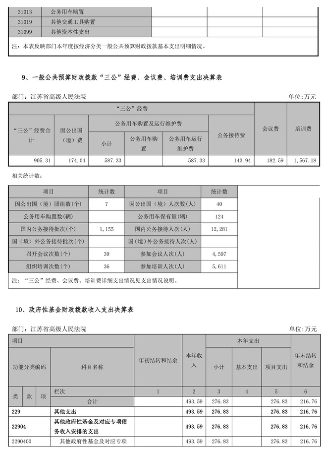 江蘇省高級人民法院2015年政府性基金預(yù)算財(cái)政撥款年初結(jié)轉(zhuǎn)和結(jié)余0萬元,本年收入決算493.59萬元,本年支出決算276.83萬元,年末結(jié)轉(zhuǎn)和結(jié)余216.76萬元。具體支出情況如下:
