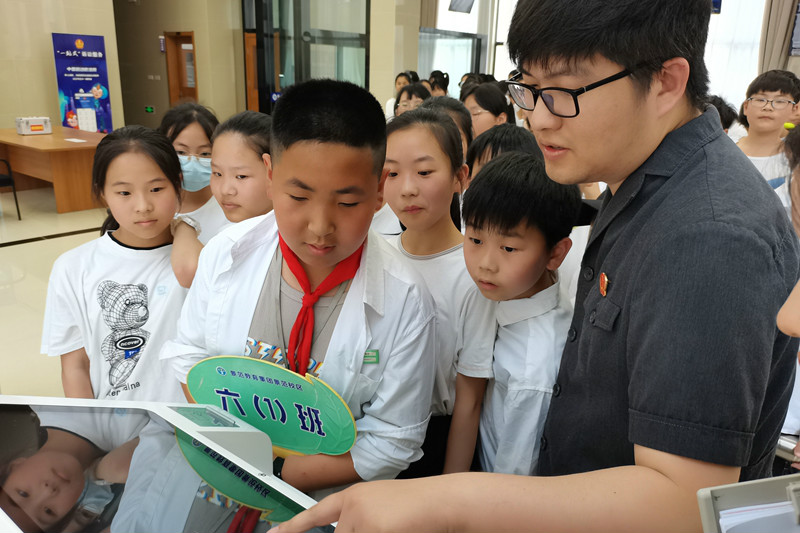 在訴訟服務中心,孩子們現場體驗了訴訟服務一體機、多媒體觸控查詢機等智能化訴訟服務設備,并了解了案件審理流程和訴訟服務中心各窗口職能。