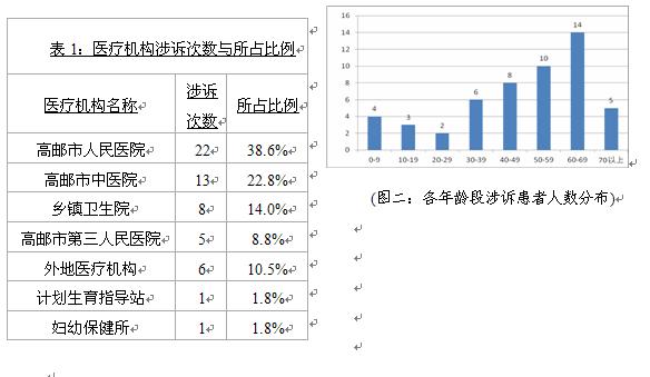 (三)涉訴醫療機構基本情況。涉訴醫療機構共17個56次,其中高郵市人民醫院22次,高郵市中醫院13次,鄉鎮衛生院8次(共涉及7個衛生院),這三類占全部醫療機構涉訴總次數的76.8%。人民醫院、中醫院規模較大,醫療活動多,多數重大、疑難疾病患者均在此求醫,鄉鎮衛生院主要面向農村患者,診療技術、條件和水平與更高級別醫院相比,存在差距,這是導致這三類醫療機構醫療損害賠償糾紛較多的主要原因。