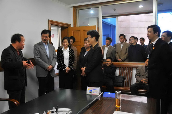 圖為鎮(zhèn)江市副市長曹當(dāng)凌、鎮(zhèn)江中院院長帥巧芳等領(lǐng)導(dǎo)與人民調(diào)解員譚星海(左一)親切交談。