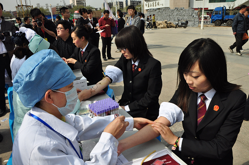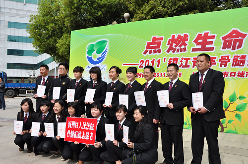 愛(ài)心在傳遞,精神在升華。為了給更多的白血病患者點(diǎn)燃生命的希望,江蘇省鎮(zhèn)江團(tuán)市委、市紅十字會(huì)組織開(kāi)展2011鎮(zhèn)江青年骨髓捐獻(xiàn)志愿者行動(dòng)。4月16日上午,潤(rùn)州法院團(tuán)支部組織了24名青年干警作為志愿者參加中國(guó)造血干細(xì)胞捐獻(xiàn)活動(dòng)。捐獻(xiàn)過(guò)程中涌現(xiàn)出不少感人事跡,如辦公室張夢(mèng)南為參加志愿者活動(dòng),毅然推遲了早已約好的婚紗攝影,法警大隊(duì)的魏濤從新警訓(xùn)練營(yíng)趕來(lái)參加活動(dòng),“黨員示范崗”民一庭全體青年干警都參加了志愿者活動(dòng),該院新選調(diào)的五名法官參加了活動(dòng),其中劉艷飛已經(jīng)有8次義務(wù)鮮血經(jīng)歷,他們用愛(ài)心譜寫(xiě)了一曲曲奉獻(xiàn)之歌。