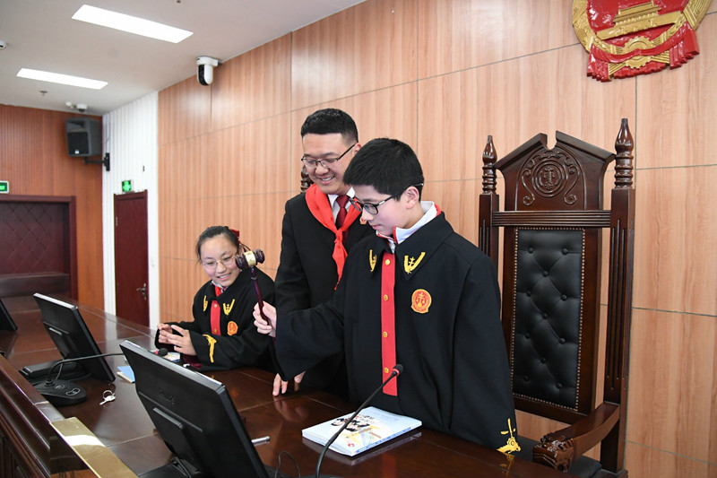 科技法庭內,李魁向孩子們講解了審判法庭的組成及整個法庭的布置,介紹了法槌、法徽、法袍的來歷和作用,并通過觀看庭審直播的方式,激發了孩子們對法院、法律的濃厚好奇心和探索心,紛紛走上審判桌進行體驗。