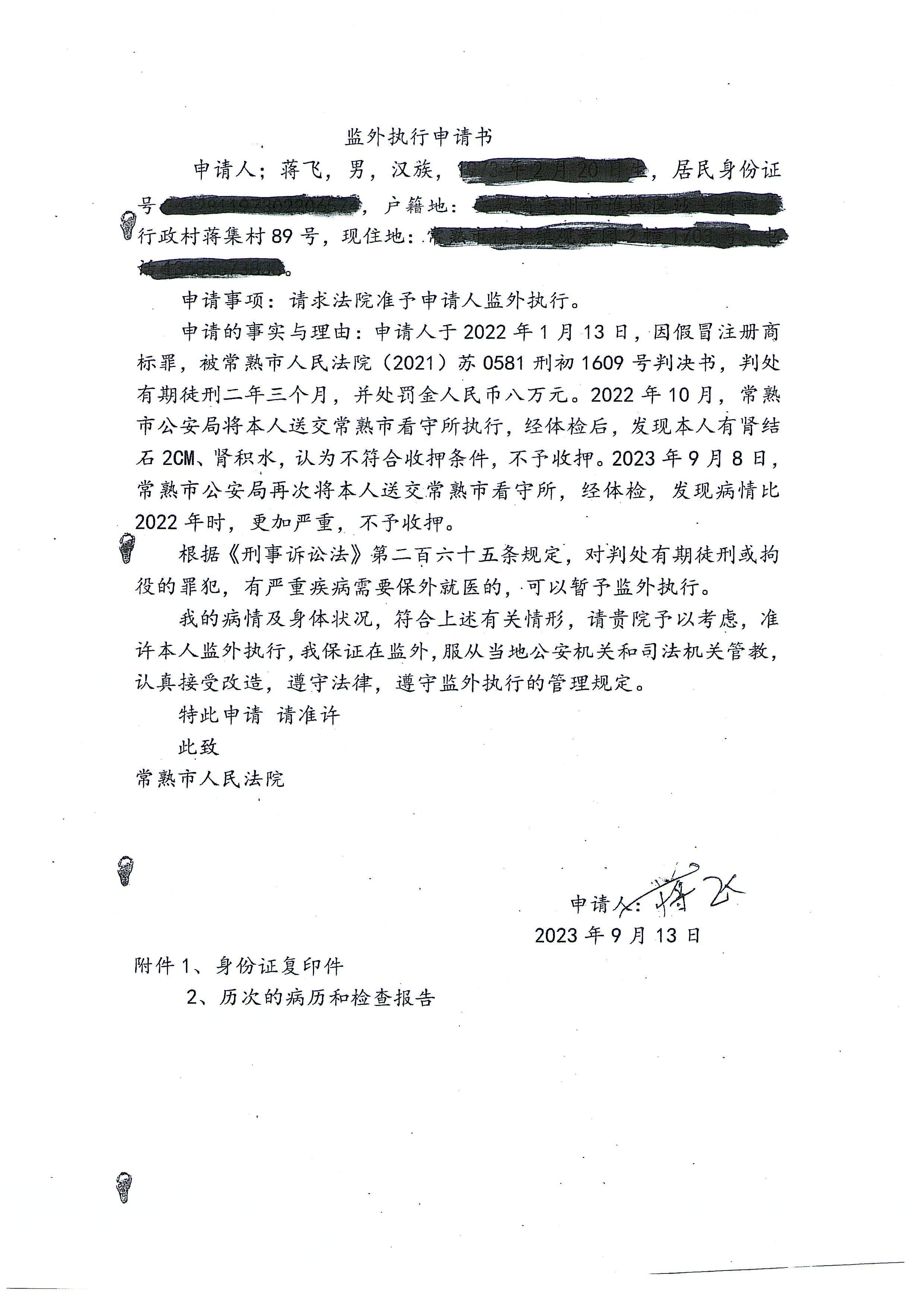 罪犯蔣飛,男,1973年2月20日出生,漢族,初中文化,常熟市戀尚家紡有限公司法定代表人,戶籍地安徽省亳州市。罪犯蔣飛因犯假冒注冊商標罪于2022年1月13日被我院判處有期徒刑二年三個月,并處罰金人民幣八萬元。案件生效后,本院交付常熟公安執行,在看守所體檢過程中查出罪犯蔣飛有腎結石2cm、腎積水,不符合收押條件。后,罪犯蔣飛向我院申請暫予監外執行。本院已立案受理,現將基本情況予以公示,病例診斷資料詳見附件。如有意見反饋,請于公示之日起三日內向我院提出。
