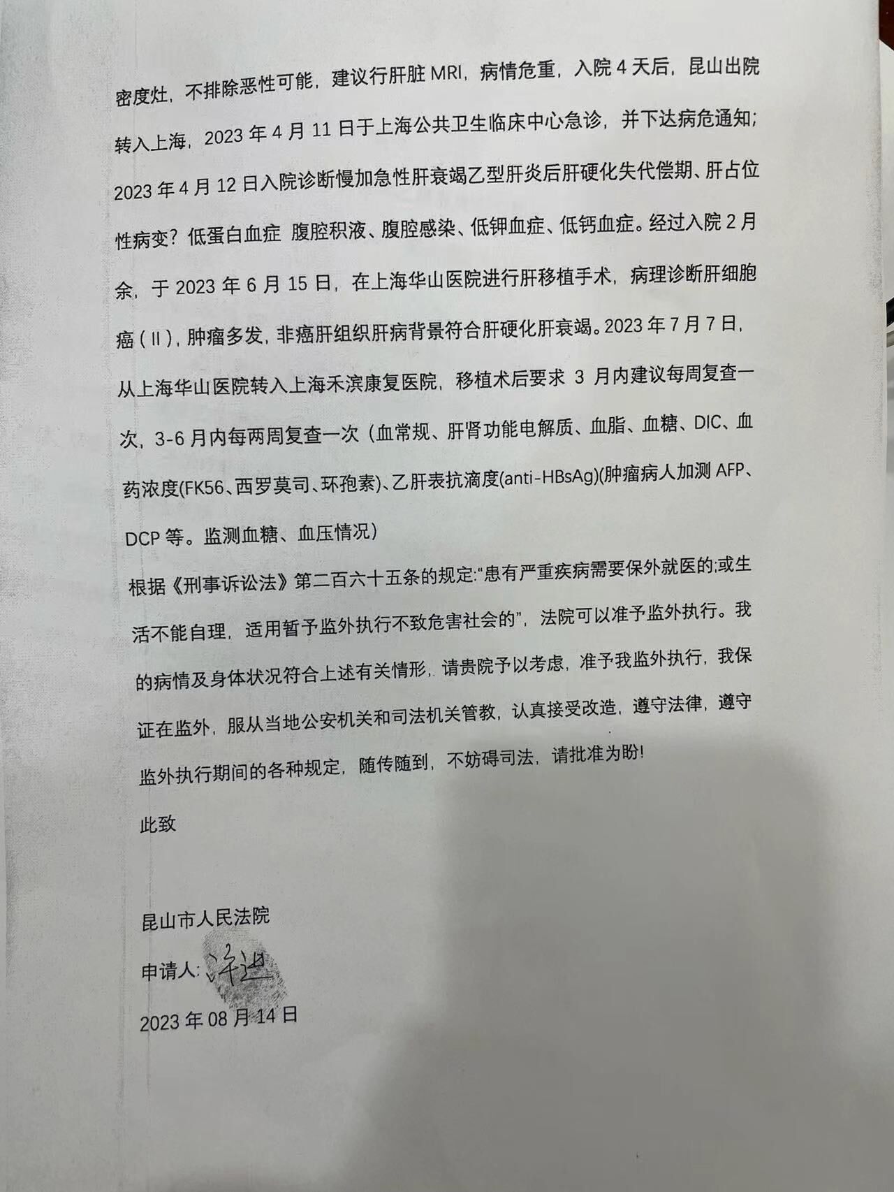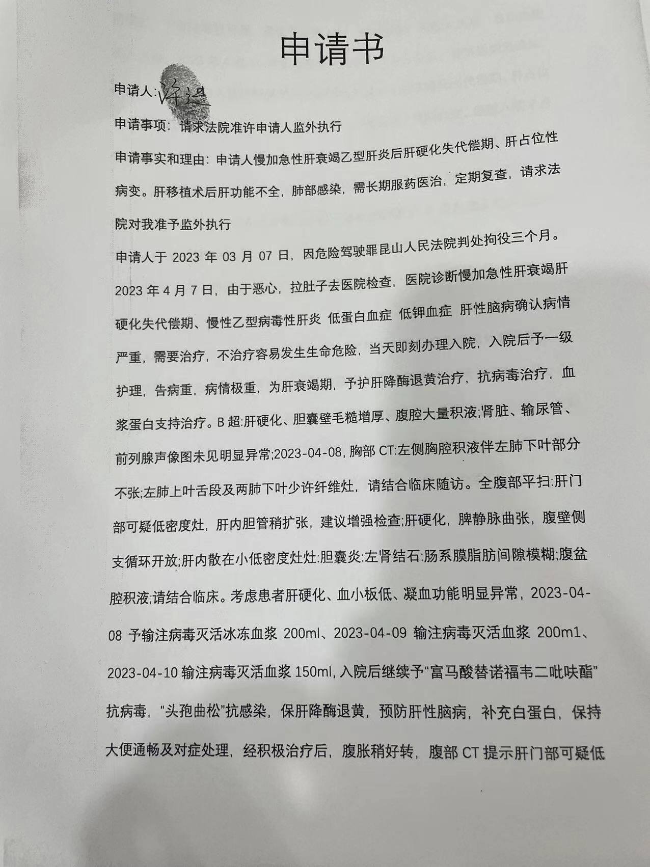 罪犯許進,男,1984年8月8日出生,漢族,中專文化,公司員工,戶籍地江蘇省昆山市周市鎮(zhèn)新浦289號1幢304室。罪犯許進因犯危險駕駛罪于2023年3月7日被我院判處拘役三個月,并處罰金人民幣三千元。案件生效后,罪犯許進因慢加急性肝衰竭乙型肝炎后肝硬化失代償期、肝占位性病變。肝移植術(shù)后肝功能不全,肺部感染,需長期服藥醫(yī)治,定期復(fù)查。后,罪犯許進向我院申請暫予監(jiān)外執(zhí)行。本院已立案受理,現(xiàn)將基本情況予以公示。如有意見反饋,請于公示之日起三日內(nèi)向我院提出。